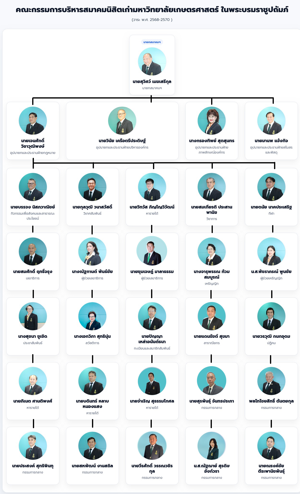 "คณะกรรมการ ส.มก. ชุดปัจจุบันนี้ เรามีการเชิญศิษย์เก่าที่มีความรู้ความสามารถจากหลากหลายสาขาอาชีพซึ่งก็เป็นตัวแทนรุ่นต่าง ๆ กว่า 20 รุ่น ที่ล้วนเป็นผู้มีความเสียสละเข้ามาช่วยกันทำงาน ทุกคนมีความมุ่งมั่นเหมือนกันที่จะช่วยกันพัฒนา สมก. และมหาวิทยาลัยเกษตรศาสตร์ให้มีความเจริญรุ่งเรือง"