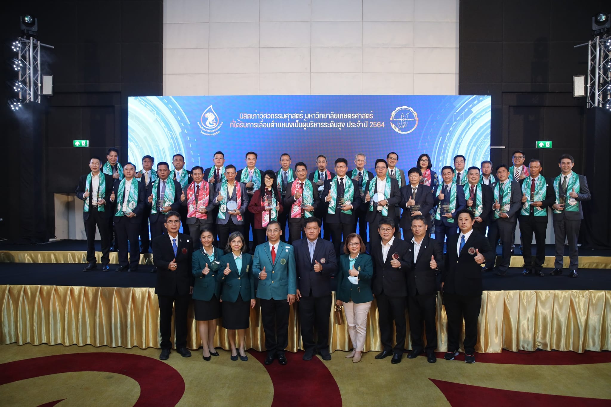 นางโสภาวรรณ มงคลธรรมากุล นายกสมาคมนิสิตเก่ามหาวิทยาลัยเกษตรศาสตร์ ในพระบรมราชูปถัมภ์ และคณะกรรมการบริหารสมาคมฯ ร่วมงานเลี้ยงแสดงความยินดีแด่นิสิตเก่าวิศวกรรมศาสตร์ มหาวิทยาลัยเกษตรศาสตร์ ดีเด่น ประจำปี 2564 และนิสิตเก่าวิศวกรรมศาสตร์ มหาวิทยาลัยเกษตรศาสตร์ ที่ได้รับการเลื่อนตำแหน่งเป็นผู้บริหารระดับสูง เมื่อวันพฤหัสบดี ที่ 16 ธันวาคม 2564 ณ ห้องวายุภักษ์ โรงแรมเซ็นทรา บายเซ็นทารา ศูนย์ราชการและคอนเวนชันเซนเตอร์ แจ้งวัฒนะ