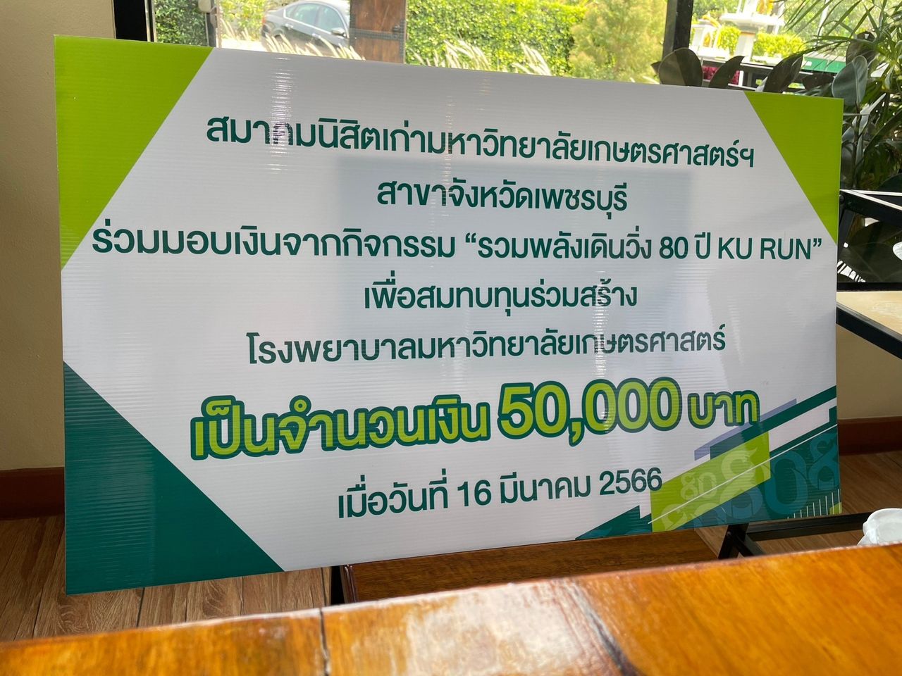 สมาคมนิสิตเก่ามหาวิทยาลัยเกษตรศาสตร์ สาขาจังหวัดเพชรบุรี ร่วมมอบเงินจากการจัดกิจกรรม “รวมพลังเดินวิ่ง 80 ปี KU Run” จำนวน 50,000 บาท ผ่านนายก ส.มก. คุณสุวิศว์ เมฆเสรีกุล เพื่อ สมทบทุนสร้างโรงพยาบาลแพทย์ศาสตร์ มก. เมื่อวันที่ 16 มี.ค. 2566